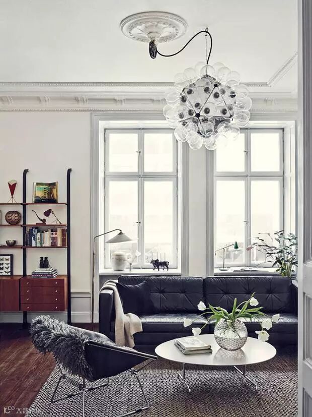 进入室内的第一感觉眼前一亮,造型别致的吊灯感觉奇特又梦幻。原木色的木地板搭配黑色皮质沙发,大气又时尚。纯白边框的飘窗和刷成白色的墙壁,再放上几盆绿植,营造出优雅又清新的居室氛围。