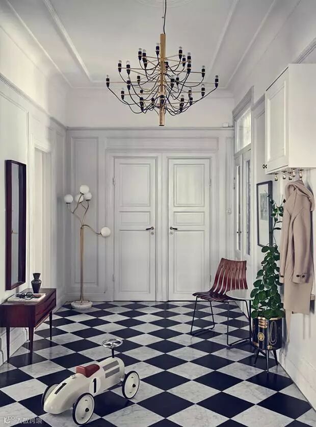 用颜色反差明显的瓷砖铺设地面,却产生了一种让人很想走进去的奇妙感觉。深红色的木质镜子与长桌,方便整理仪容和收纳,而且还有一种尊贵大气的感觉。