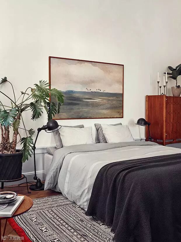 黑白灰搭配的卧具十分具有现代感,墙边雕刻的花纹和吊顶,表现出一种低调的华丽感。床边的原木柜子上摆上几根蜡烛,夜幕降临,关掉灯光,点燃蜡烛,浪漫的让人心醉。