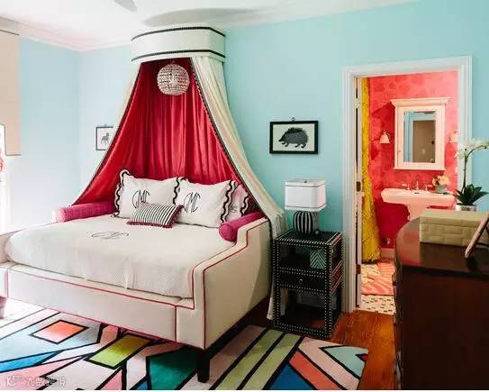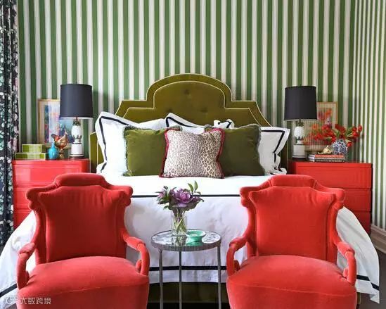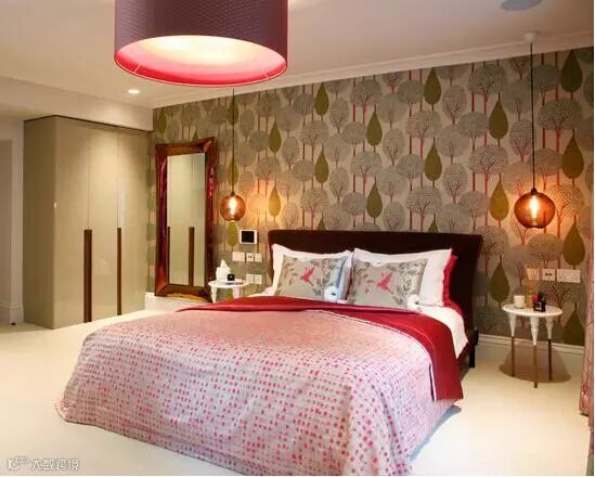 地板+绒毯,是卧室地面装饰的最佳组合。洋红色调演绎温柔甜蜜,为空间增添跃动饱满的感觉,床边经典黑红线条起到点睛装饰的作用。