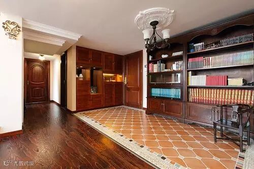 深色木门搭配深色地板,常用于保守设计或者传统风格的设计,这样的搭配比较常见,传统的装修理念是墙面或者门的颜色应该浅于地面,这样可以拉伸空间视觉感。中色地板相对来说使用频率非常之高,属于比较保险的颜色,即使搭配不好也不会错到哪里去。中色地板+深色门的搭配方式非常常见,很多风格上都有运用。