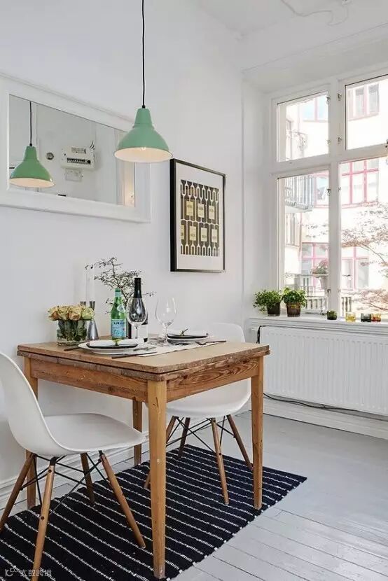 白色伊姆斯餐椅,实木方形餐桌,打造出一个小型的双人用餐区。