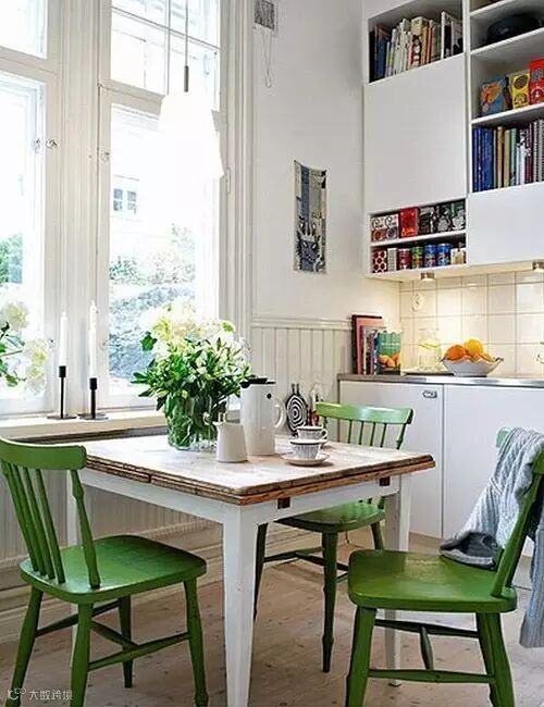 做旧的实木餐桌,绿色温莎椅,搭配出一种质朴的乡村味道。