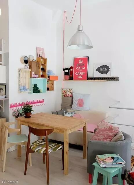 有限的空间内,多摆一张桌子都嫌浪费。爱做各种手工的女孩,不妨布置这样兼容风格的餐厅/手工工作室,毕竟吃饭的时候你是绝对不可能同时做手工滴,正好可以一室两用。而这样有着浓浓手工布艺风情的餐厅布置,也绝对有个性。