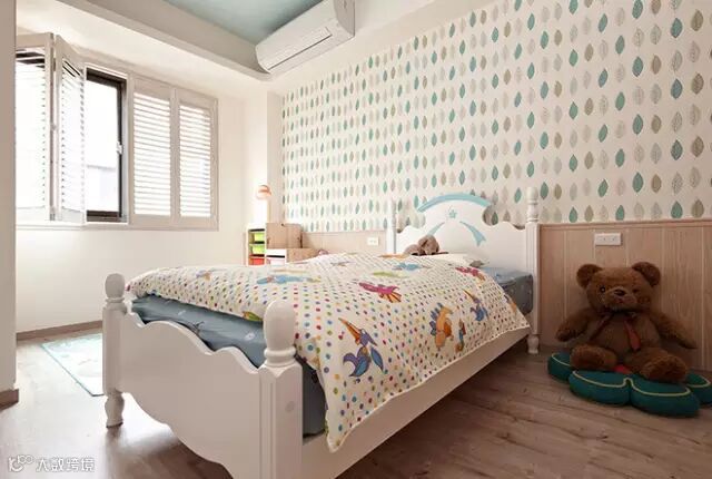 ▲浅木色腰板与童趣风格壁纸,一展男孩房的清新格调,并一反传统作法,于天花底层饰水蓝喷漆、角落配置云朵饰板,打造云端般作梦的纯真天堂。