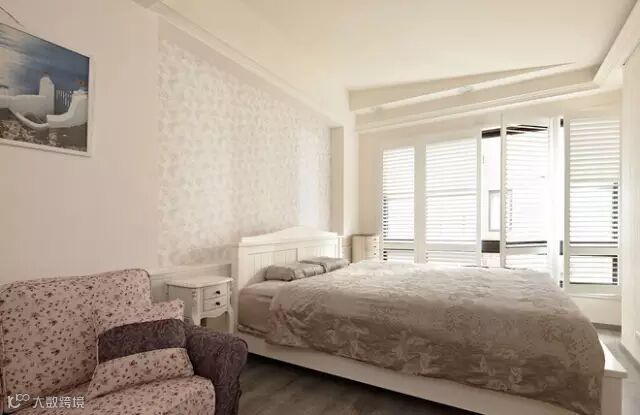 ▲白色饰底的主卧房内,透过木作腰板与百叶窗呈现美式乡村风,另外在灰色木地板、碎花壁纸与斜向天花设计中,搭配紫色系沙发,跳出色彩层次亮点。