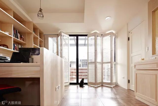 ▲小猫静伫窗前,大面日光穿透折叠式白色百叶窗,自然涌现美式乡村情境。