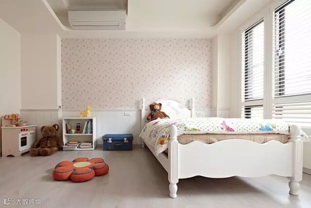 ▲粉红色彩与白色腰板铺叙的女孩房中,天花缀以造型花朵呼应整体氛围,另在卫浴前规划更衣段落,让女孩的大量衣饰有充足收纳空间。