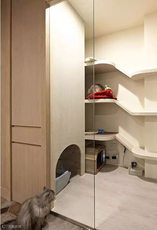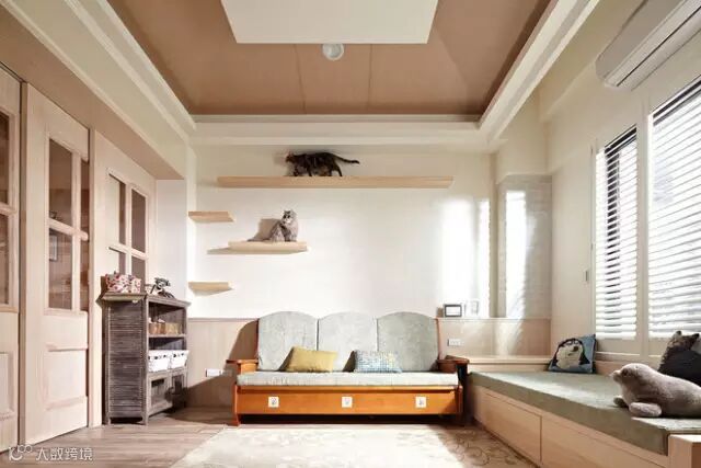 ▲在墙面上的层板可让猫咪自在上下活动。