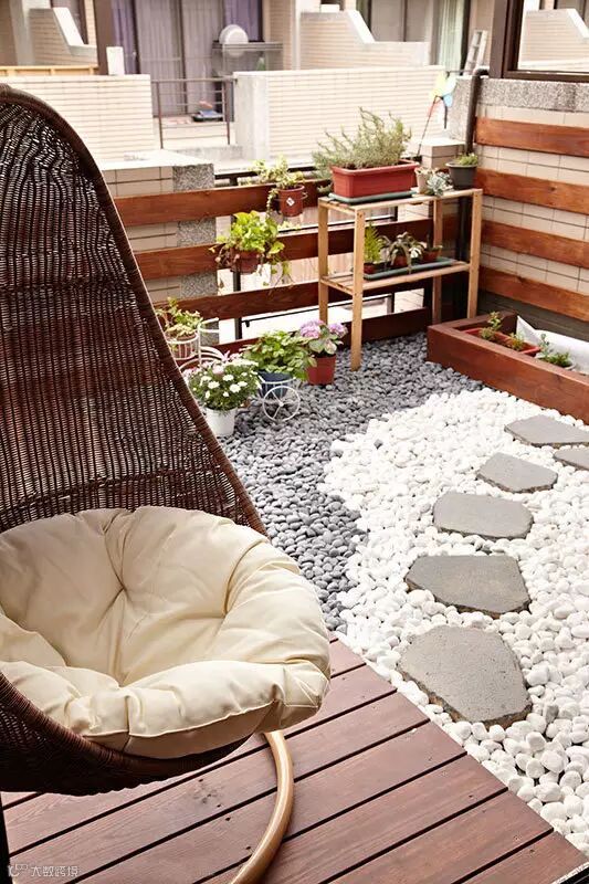 ▲铺叙卵石小径、配置藤编摇椅,大面留白的露台是喘息小歇的日光角落。