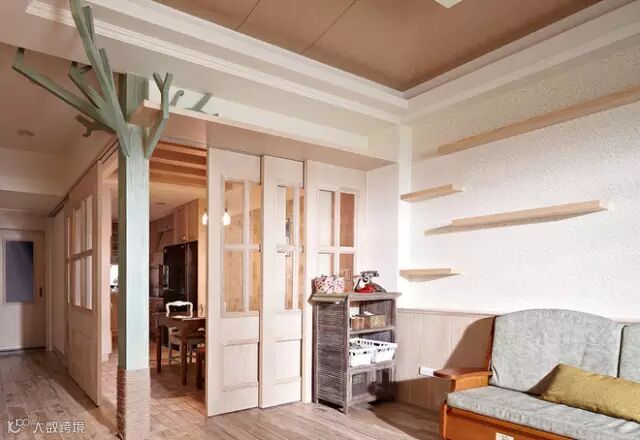 ▲分界客餐厅的格子窗门片采弹性规划,屋主特别要求的树状支柱,经过多次尝试与比例调整,画龙点睛呈现自然感空间氛围。