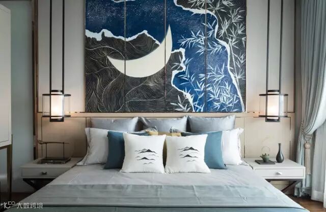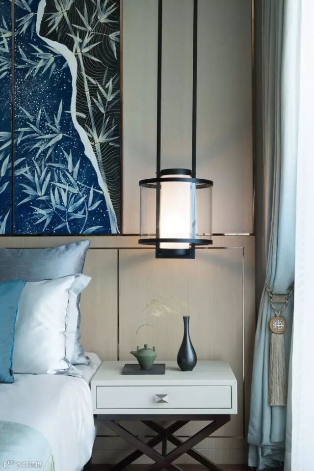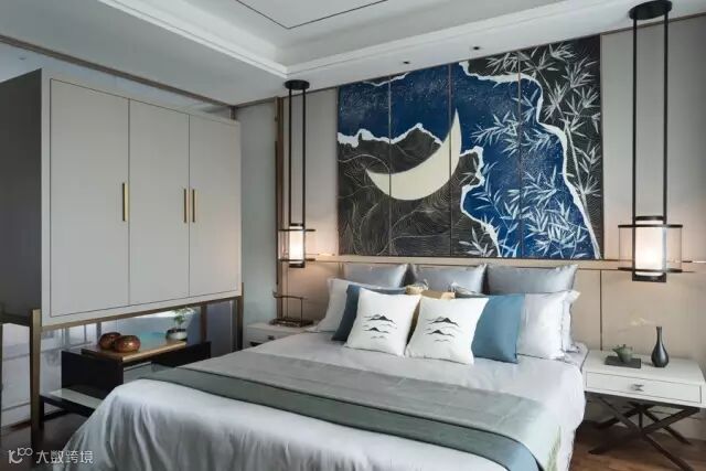 设计师关照不同的需求,不同的居室被赋予了不同的情性。主卧,以蓝灰色为主调,与原木纹理的家具中,凸显着原始之美。于山山水水、月光竹林的隐士意境中,找到心灵的平衡和安宁。