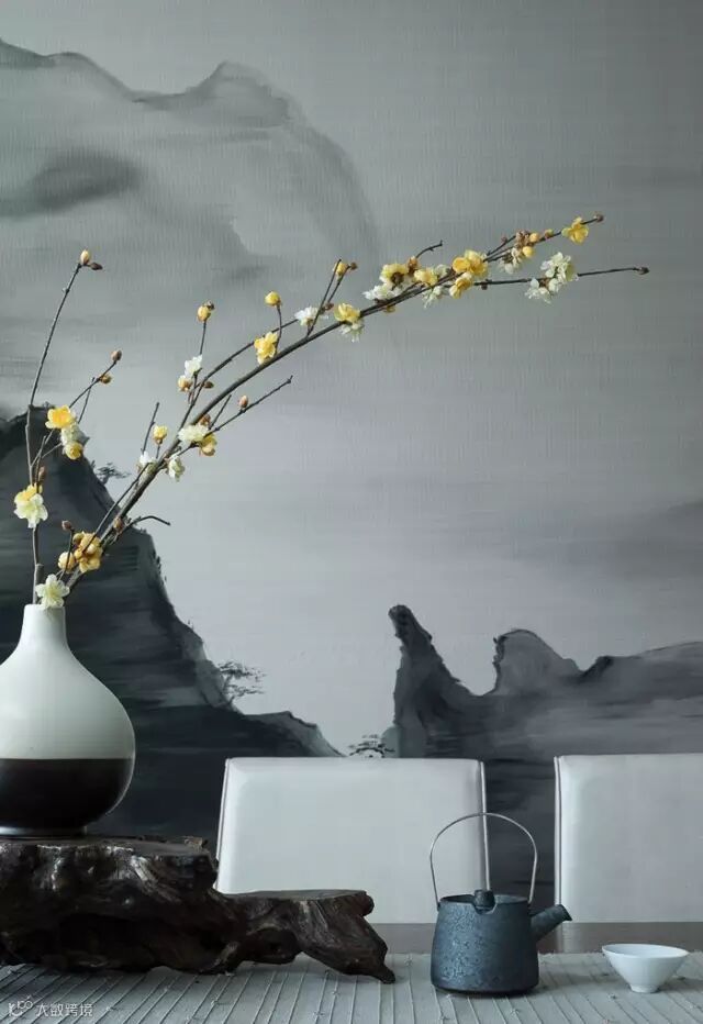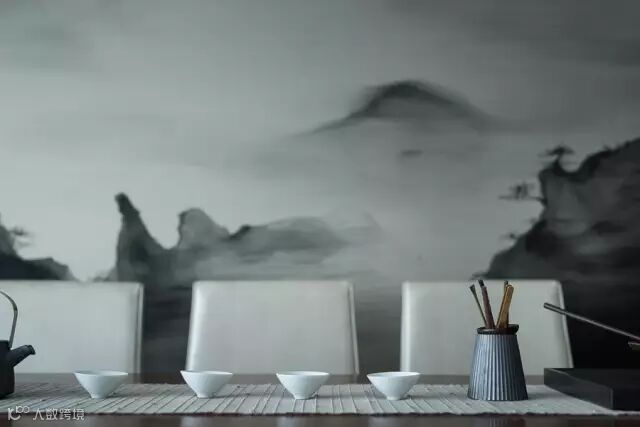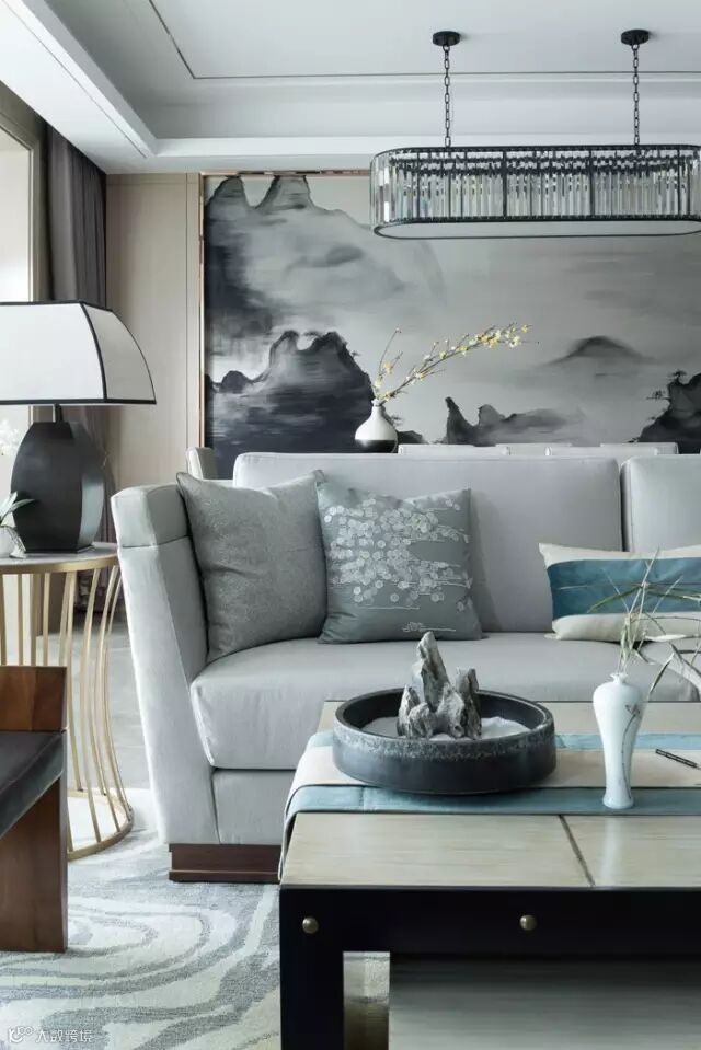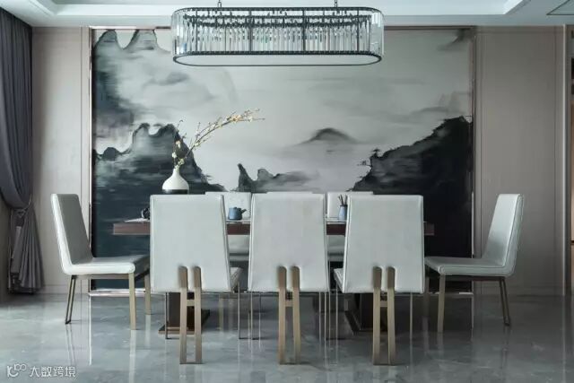 随着视线自然过渡到餐厅,餐厅的设计兼容了宴客礼仪和文人情怀,在灰色的基调中,璀璨的水晶吊灯洒下温馨的光景,设计师别出心裁地以写意山水画来装饰背景墙。气派的大理石圆桌、独家定制的餐椅与中国茶道在同一时空对话,隐喻独到的审美和非凡的气度。