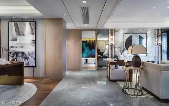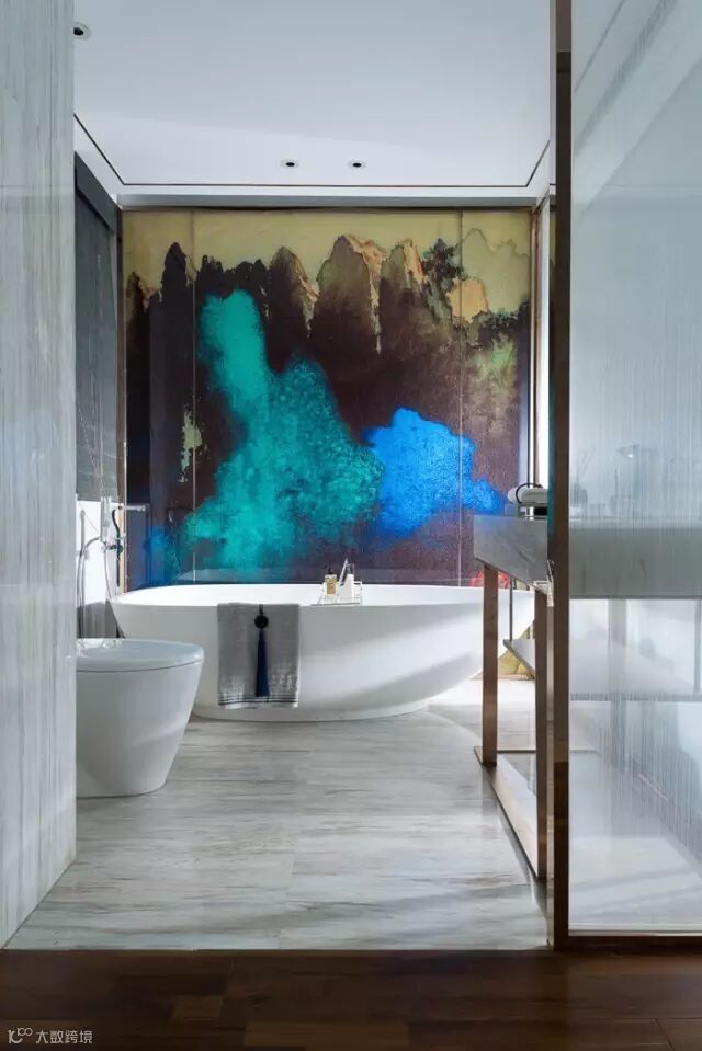同一种语境下,设计师用不同方式细腻搭配材料,更多的发挥材料本身的属性。蓝绿撞色的山水画背景墙,选以琉璃材质打造,吊顶及门框镶嵌铝合金材质的包边,线条简洁,又不乏时尚感。