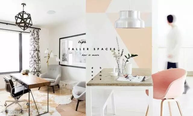 不要让墙壁和天花板使用强烈对比的两种用色,同一颜色会有延伸的效果,这就和穿肤色高跟鞋,会让你的腿看起来更长的道理一样。