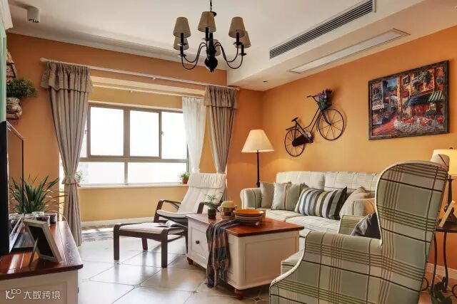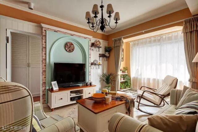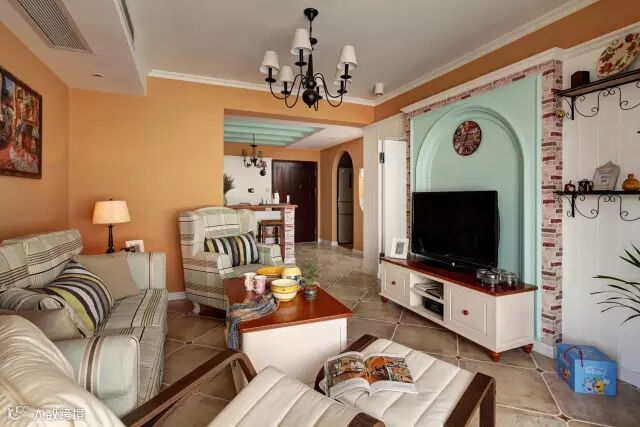 这是一套平层小公寓,在色调上,选定以暖色调为主,冷色调为穿插,乡村地中海田园混搭风格使得它凸显温馨惬意,让生活在其中的人感到亲近和放松的舒适感。