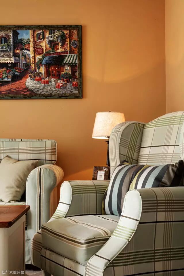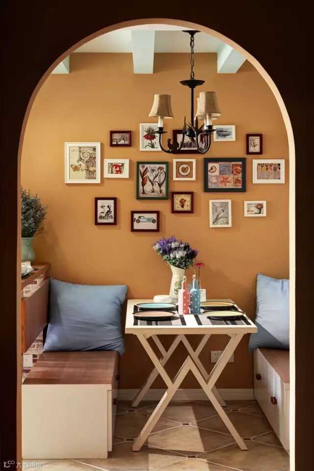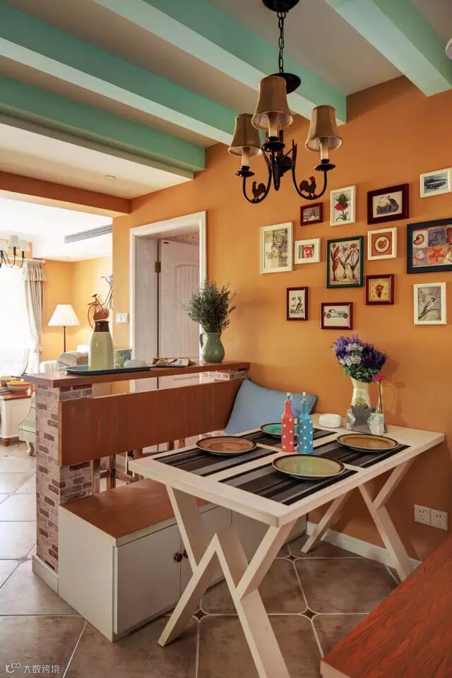 ▲在入户后的第一个生活空间,用悠然自得的餐厅给人带来友好的印象,其中的简约的卡座设计既美观又实用,加上欢快的橘黄色墙面和精美的自然主题装饰画,塑造出具有小资品质的乡村情调。
