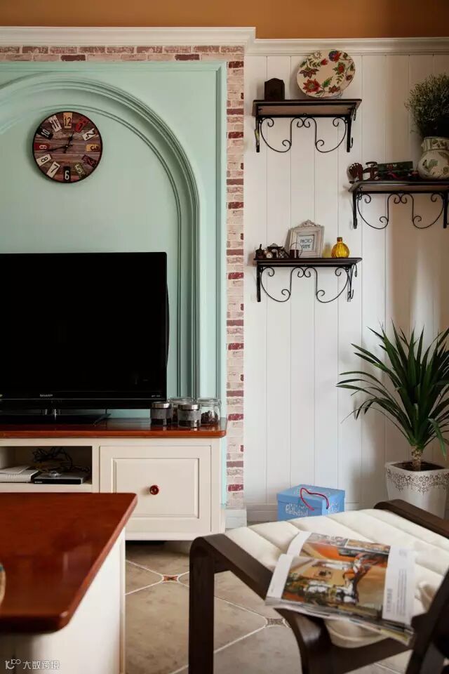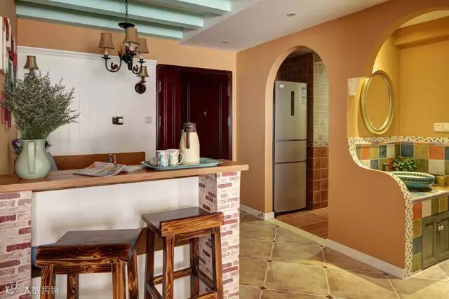 ▲本案的田园风格中还带有美式与地中海的元素,使整体气质更加自由、浪漫。吧台划分了餐厅与客厅的空间,却在两者之间维系与传递着优雅的生活原味。用砖纹贴纸代替真正的红砖,既美观又更好打理。