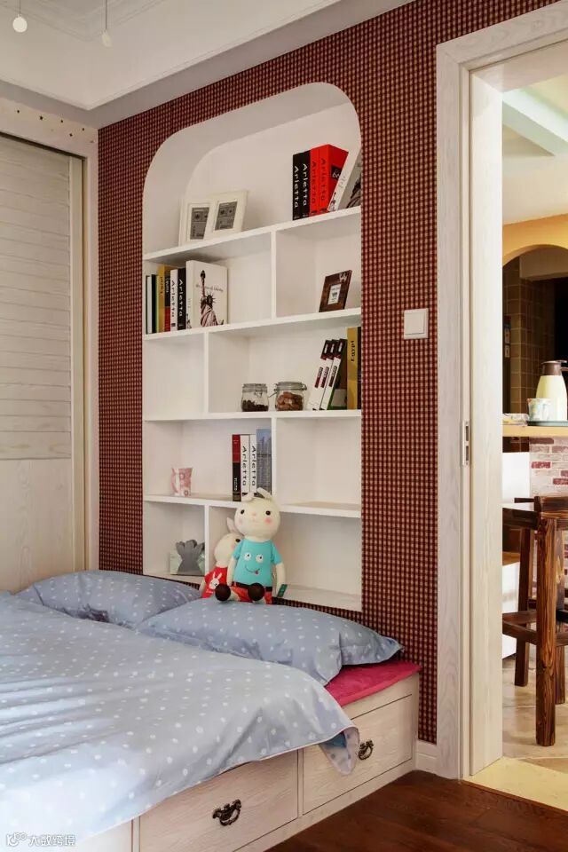 ▲设计了带有收纳抽屉的榻榻米作为儿童床,又用收纳书架填补原本与餐厅之间的墙体留空,加上衣柜采用了平墙的处理,使空间的合理性、实用性、利用率都得到提升,同时也不会破坏整体感。