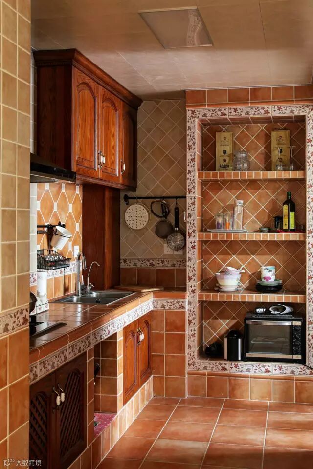 ▲厨房内的空间,以甜蜜温暖的“红糖色系”,将视觉之美与味觉之美结合起来,砖砌的餐具架上摆放红酒木牌,细节上呈现主人的精致品味。