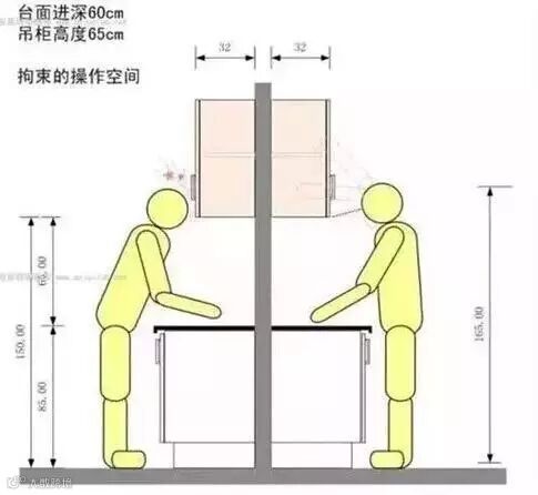 一般情况下,灶具台面的高度大约以65厘米—70厘米左右为宜,操作台及洗碗池大约以80—85厘米为宜。同样道理,如果厨房用具过于低矮,人在做饭的过程中,常需要弯腰,颈部、腿部都很容易因受累而疲惫,容易使腰背、脊椎和颈部反复劳损而受伤。