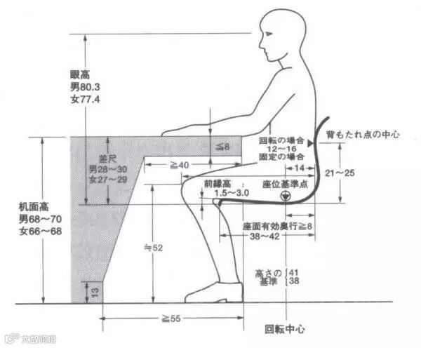 桌椅高度差在280mm—300mm之间,写字台下面的高度不小于580mm,宽度不低于520mm。坐在椅子上两脚平放时,如果大腿与地面平行,小腿能够基本垂直于地面,那么椅子高度就合适。椅子离地面太近,人坐在上面,腿部很难伸直,下肢处于弯曲的状态,腿部关节不能放松,长久下来,腿部、腰部和手臂极容易疲劳,可能导致一些腰部疾病及关节炎的发生。