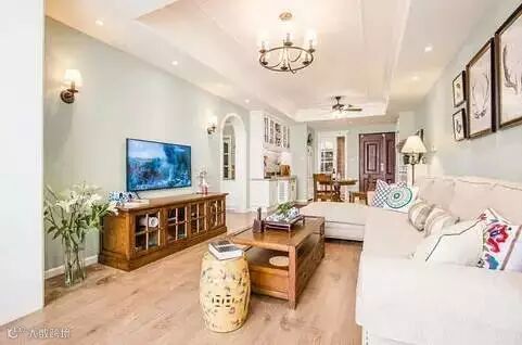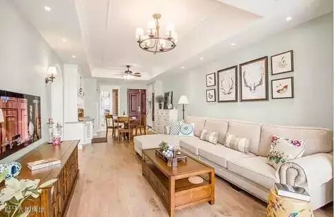 水蓝色墙面,木质复古风茶几和电视柜,墙角放着花束,圆凳和抱枕上鲜花盛开,背景墙上蝴蝶飞舞,置身客厅仿佛是在森林中漫步。