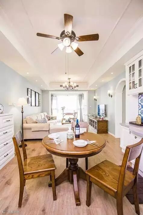 从餐厅向阳台望去,水蓝色墙壁和白色天花板相接,房子特别明亮、宽敞。