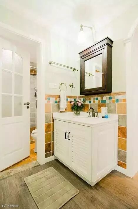 深棕色柜子里收纳洗漱用品,柜门安装一面镜子,生活精致、优雅。