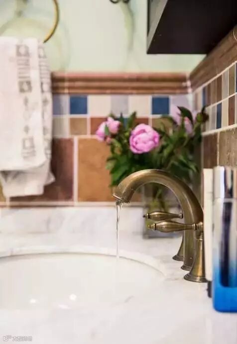 水龙头也是复古铜质的,洗漱时低头起身都能看到墙角盛开的鲜花。