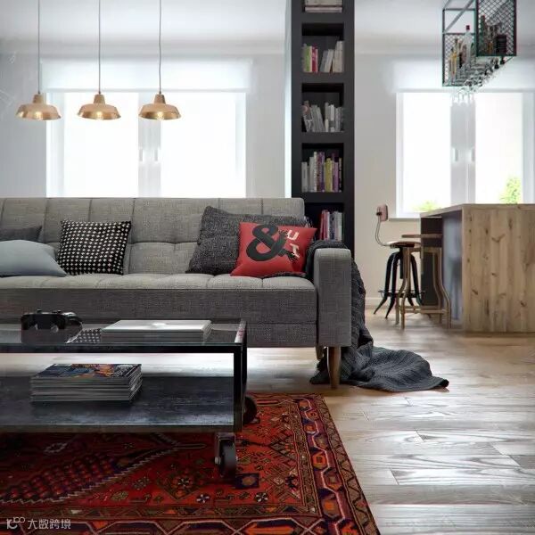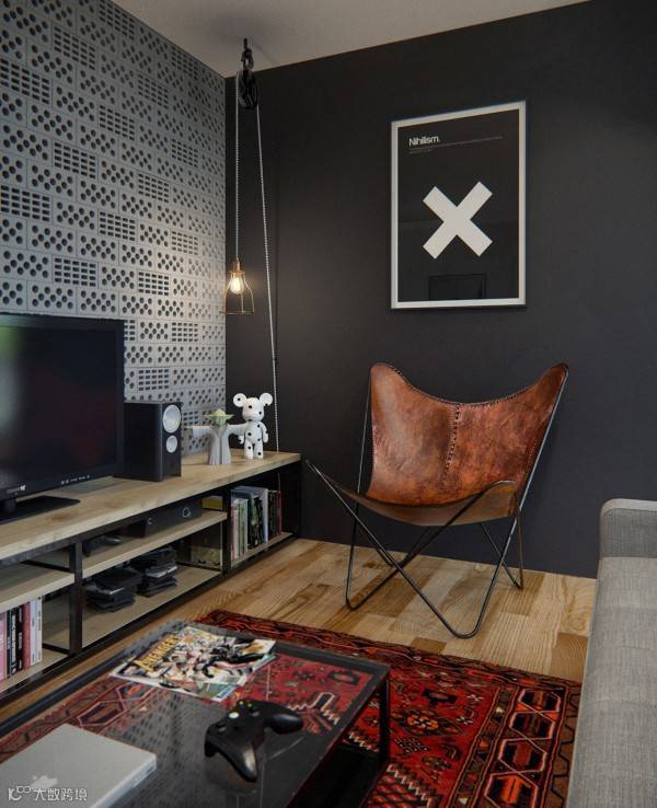 工业风格电视背景墙和温暖的皮革椅子带来一种古老的感觉。