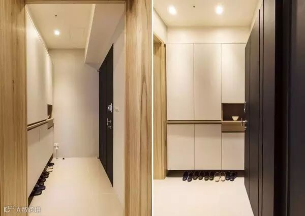 在玄关处有大容量的收纳空间,有嵌入展示柜、以悬吊式的鞋柜,这样经常使用的室内拖鞋就可以放在下面。