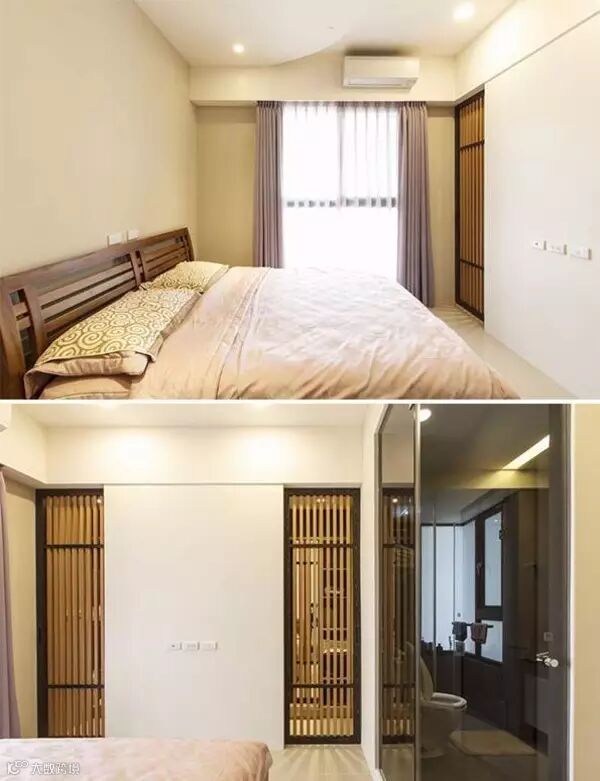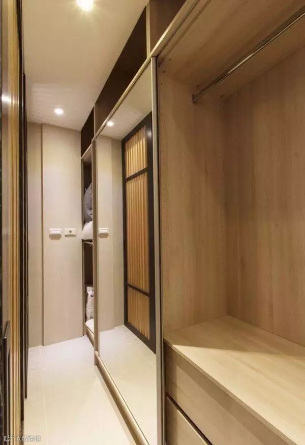 原本只有让一人通过的过道,设计师设计了双向循环动线让两人可同时拿东西、换衣服;落地镜面拉门放大空间,平时收于电视墙后,格栅拉开时可作为卧房内的更衣镜。