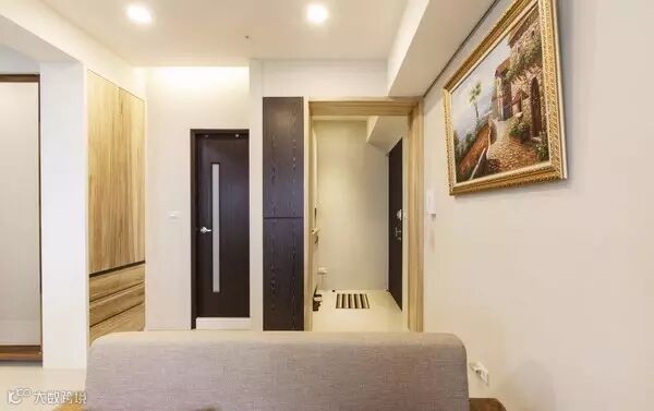 浅色的门套划开了空间的内外之隔,进门就能感觉到整个空间的大气;利用门框深度创造的生活备品柜,以深色的木皮跳色处理,与卫浴的门相互呼应。