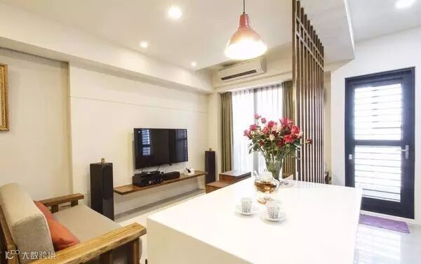 保留柚木的自然纹理,进门就可以看到复古的单人椅子映入眼帘,与双人沙发椅的组合,取代原先餐厅的位置,扩大客厅的使用范围。