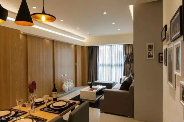 两个背景墙,电视背景墙部分用来通体的木饰面,沙发背景墙用的是涂料和照片墙相结合。