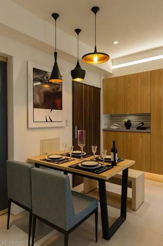 餐厅很紧凑的选择了一个地方,旁边就是门,墙边是鞋柜和装饰柜,整个柜体也是和电视背景墙一样用木饰面做的装饰面。