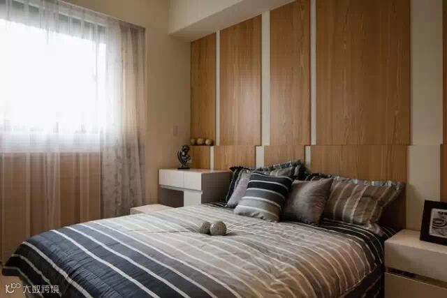 电视背景墙的木饰面元素和色彩在卧室又有了延续。