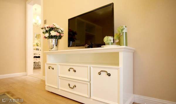 象牙白的电视柜,一束鲜花为生活增添浪漫,让空间多了一丝春天气息,尽显清新雅致的田园风情。
