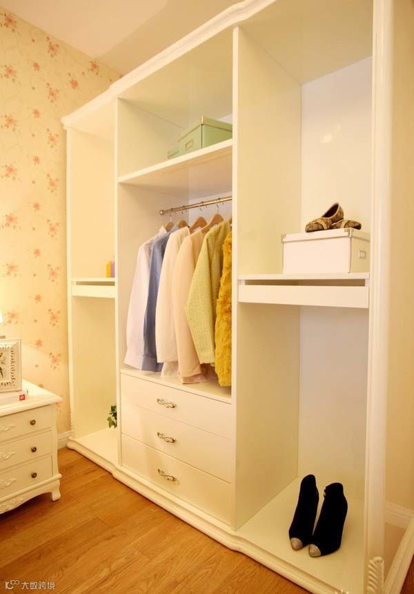 靠墙放置的简约白色衣柜,既可以收纳衣物,又能展示装饰品。