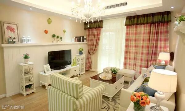 格子窗帘和条纹沙发在浅米色的空间内跳跃,与线条柔美的白色家居搭配得非常和谐,花草装饰恰到好处地点缀空间,打造清新感十足的韩式田园风范