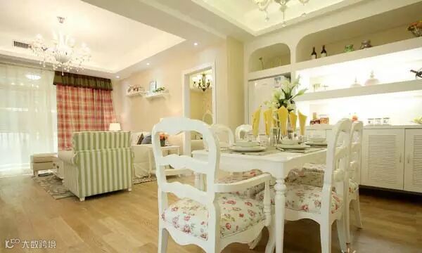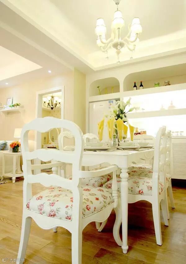 这套韩式风格餐厅装修既简洁,又唯美,花朵造型的吊顶,碎花元素装点座椅,线条柔美的白色餐桌,感受充满浪漫情调的韩国风情。
