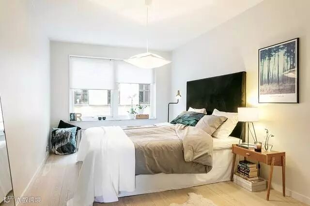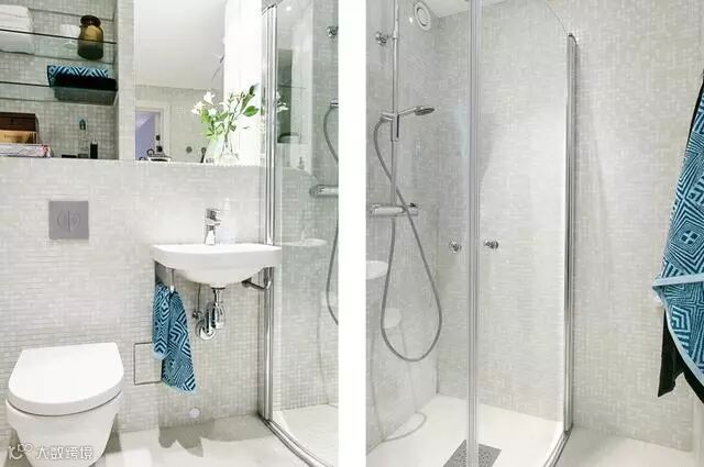 素雅干净的卧室,营造出一种安逸舒服的氛围,浅色的墙面,融合进去的深色的点缀蓝,优雅又有品位。浴室依然惯用白色的瓷砖,采用干湿分离,白色的玻璃门让空间看起来没有那么狭小。蓝色的毛巾给素净的卫生间增加了一些色彩。