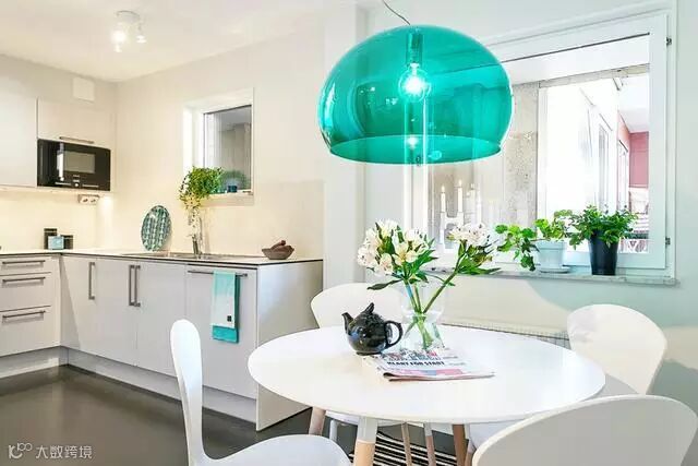 餐厅选用白色的餐桌,湖蓝的琉璃罩灯,整个餐厅都透露出一股清新的味道。