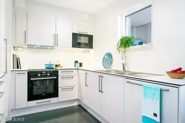 L型的厨房设计不仅节约了空间,蓝色的厨具和蓝色毛巾成了点缀之笔。
