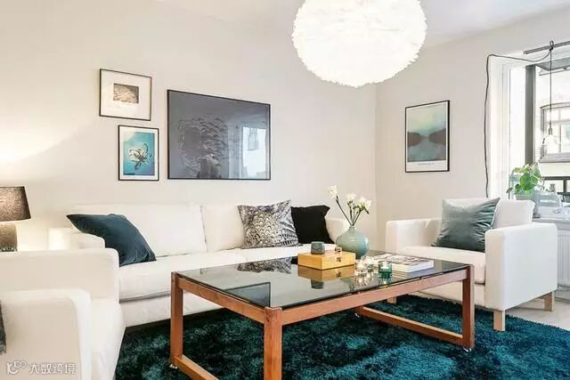 客厅里孔雀蓝的地毯非常吸引人的眼睛,不仅压住了空间的反光,还和整体的素净感形成对比,增加了空间的跳跃感。白色的布艺沙发与白色大理石让这组北欧风格的装修更加宽敞明亮。