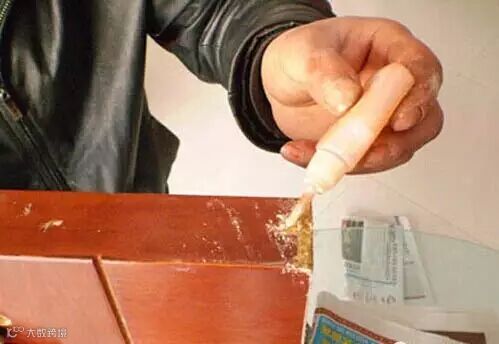 接着,用502胶水、锯末对受损处进行修补。然后用小刀铲平。(这道工序需要反复进行,直到修复处没有坑洞,与周围平整即可。)