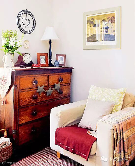 墙角里的复古斗柜非常有质感,复古的颜色完美的体现出年代的气息,斗柜上面还有一些简单的雕刻装饰,赋予了斗柜不凡的设计感,斗柜上面摆放的东西突出了生活的惬意感。