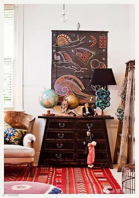 居室中的复古斗柜不是一个规则的形状,梯形的斗柜看起来与众不同,从上到下的延伸感相认感觉很轻松,尽管它带着浓郁的年代气味,但还是感觉很亲切,上面的摆件非常的贵气。