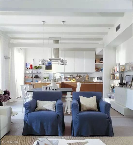 白色浸透,蓝色浮现。起居室、餐厨空间一体,功能分区。